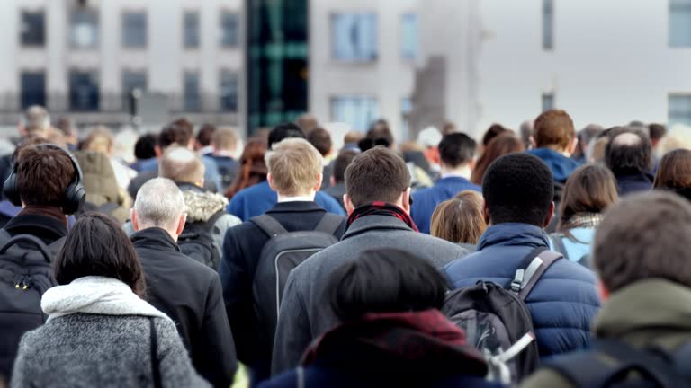 Back view of a commuters walking away from camera, slightly elevated. 4k.